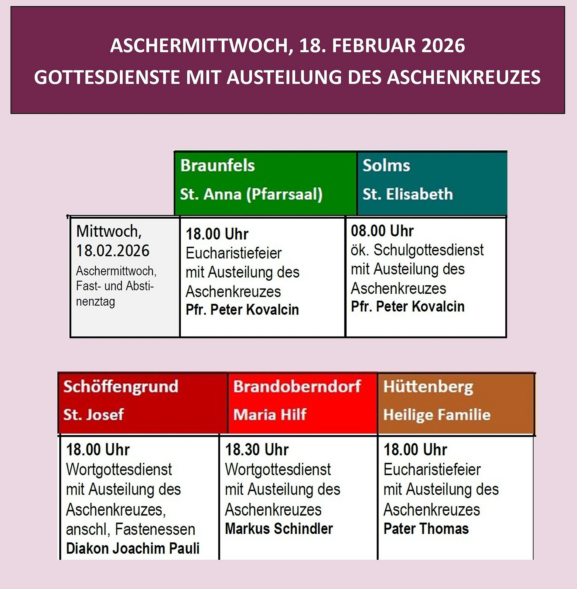 Die Gottesdienste zum Aschermittwoch mit Auflegung des Aschekreuzes finden Sie im Pfarrbrief und auf der Grafik nebenan.