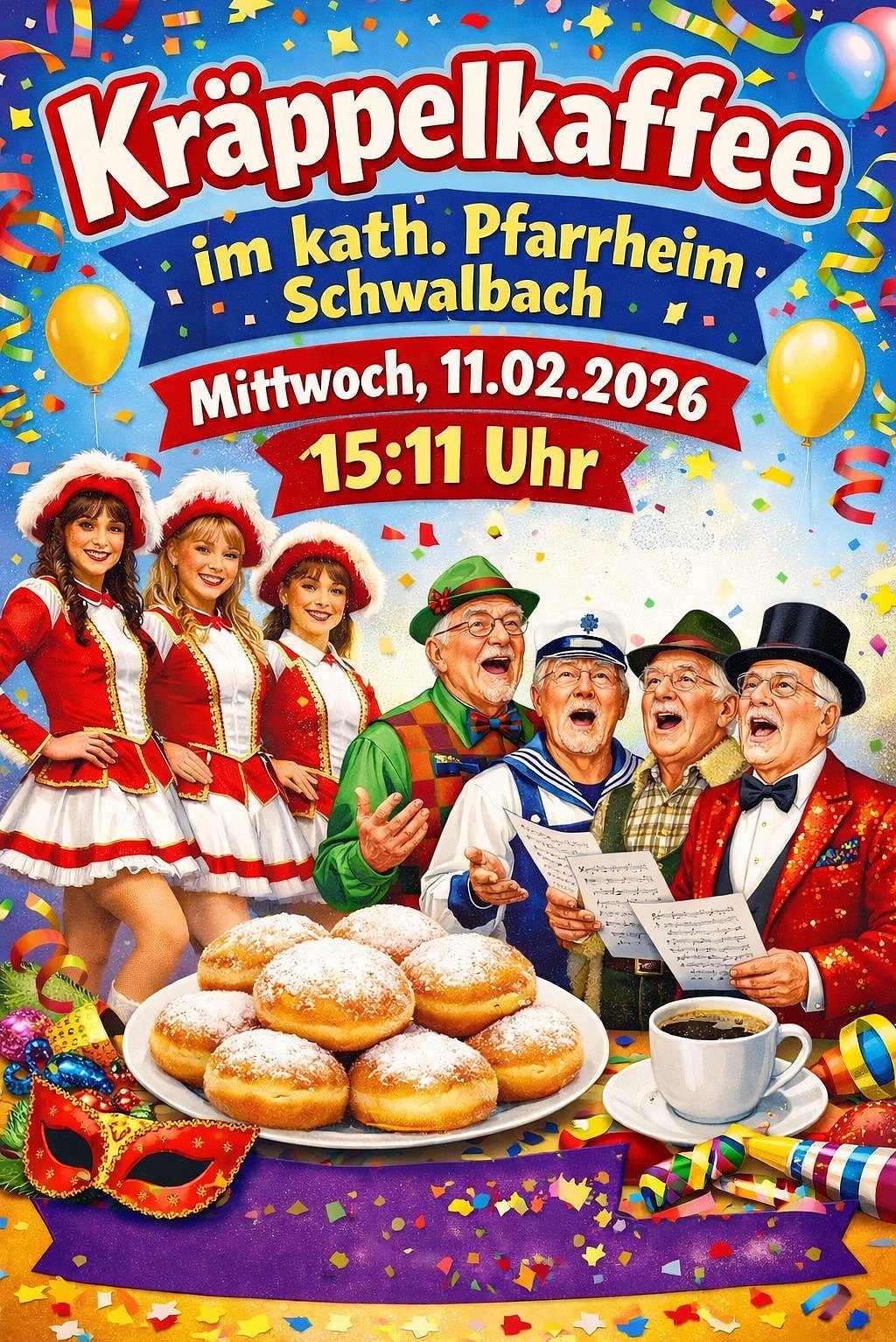 - Kräppelkaffee im katholischen Pfarrheim Schwalbach: Mittwoch, 11. Februar ab 15:11 Uhr