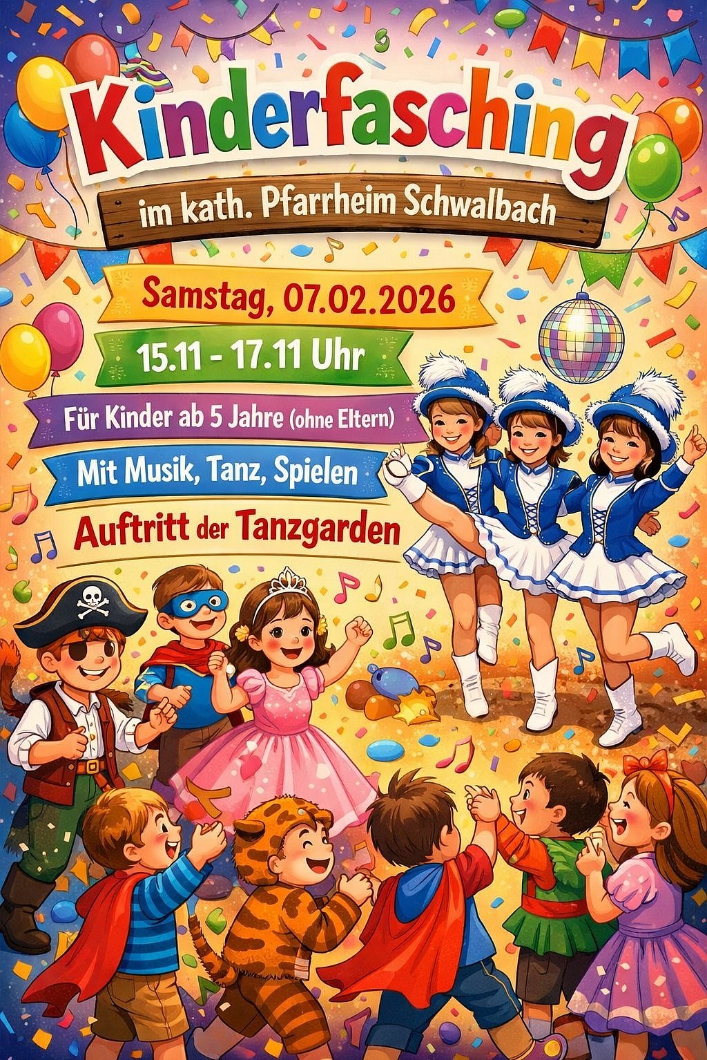 - Kinderfasching im katholischen Pfarrheim Schwalbach: Samstag, 7. Februar von 15:11 - 17:11 Uhr mit Musik, Tanz und Spielen und Auftritt der Tanzgarden.
