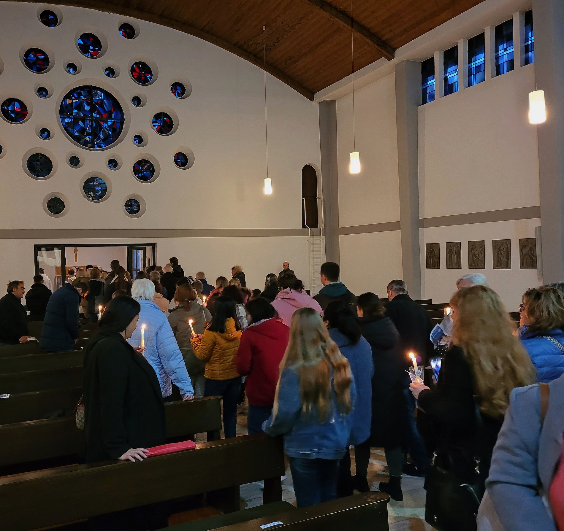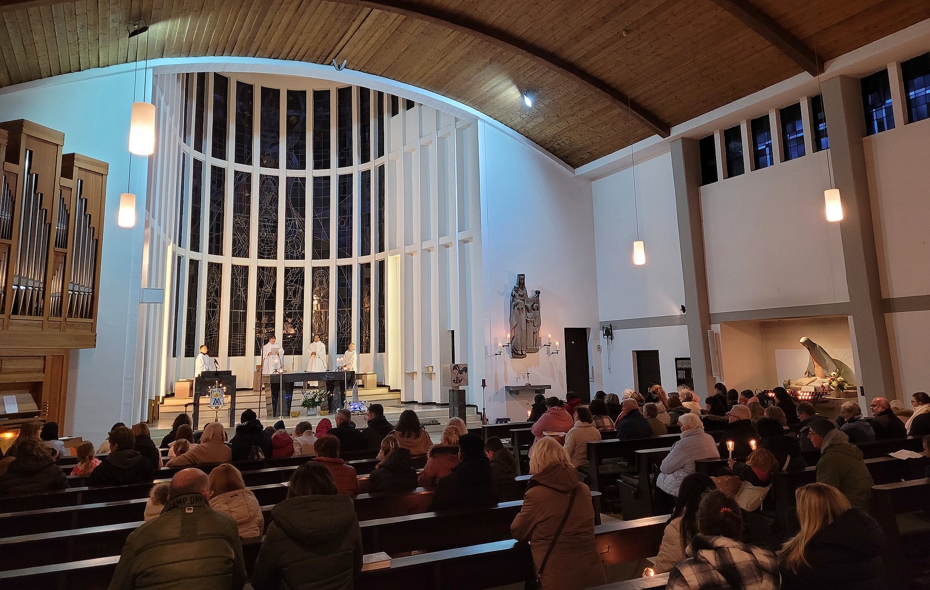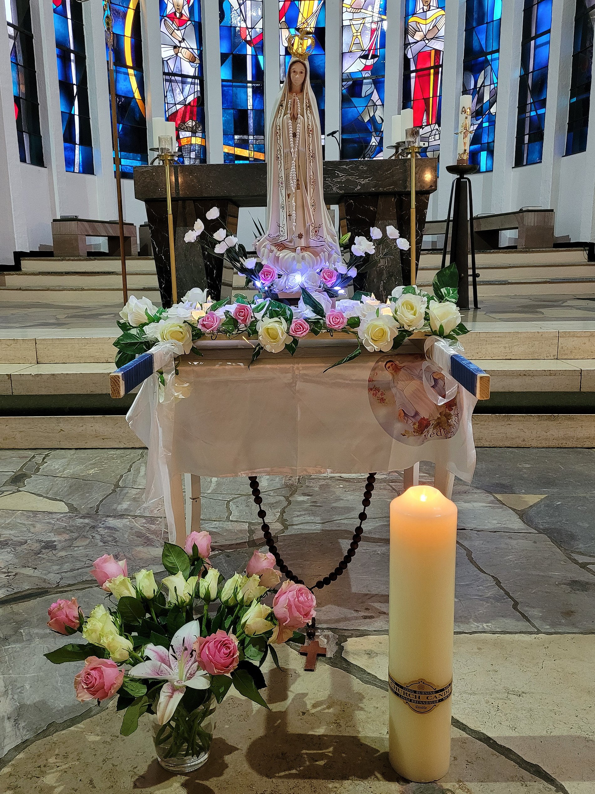 Über 100 Gläubige, darunter viele Kinder und Jugendliche sowie Familien, waren in die von vielen Kerzen erleuchtete Kirche St. Elisabeth gekommen, um eine Heilige Messe mit Rosenkranzgebet und anschließender Prozession zu begehen. Andächtige Gesänge der Kirchenglöckchen, des Magnificat-Chores und der Gemeinde begleiteten die Gebete und die Prozession, in einer weihevollen Atmosphäre. Wie eine Besucherin sagte: „Es war so schön, diese Andacht ging ins Herz hinein!“